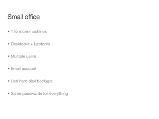 The document provides tips for exploiting PCs and Macs to make them work better for businesses. It discusses setting up email and backups, using remote access and meetings without travel, creating secure passwords, installing antivirus software and keeping systems updated, and recommends tools like Dropbox, Google Reader, and Evernote to help organize work. Contact information is provided to answer any additional questions.