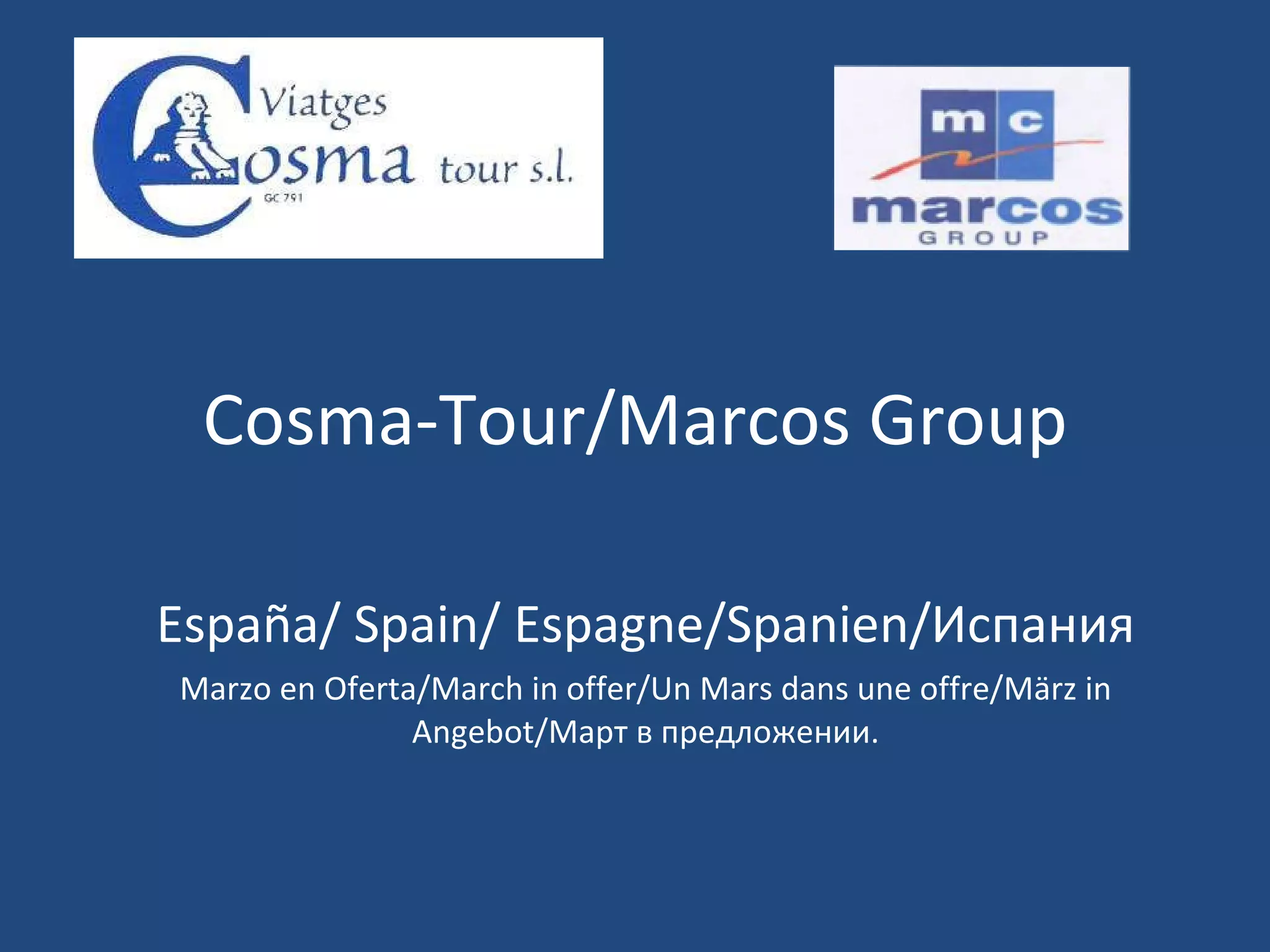 Cosma-Tour/Marcos Group. Dirección/Adress/Direction:Central Office: C/ Cervantes, 2, Local 3 y4. 08397 Pineda de Mar, Barcelona, Spain. Delegaciones: Salou (Costa Dorada), Torremolinos (Costa del Sol), Palma de Mallorca (Baleares), Madrid, Barcelona y Andorra. Ver otra presentaciones/ To see other one presentations/ Voir l’autre des présentations: http://www.slideshare.net/JoseMariaSanchezMorente TLF: 34-937662707-(08)-(09). Fax: 34-937662707. Email: [email_address] [email_address] [email_address] Web: www.cosma-tour.com www.marcos-group.com