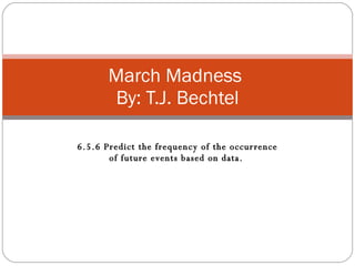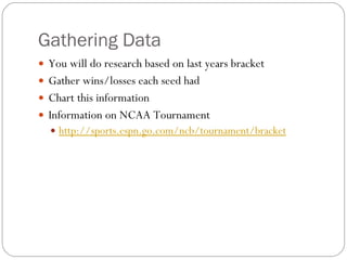 The document provides instructions for students to make predictions of the outcomes of March Madness basketball tournament games based on data analysis. Students are asked to gather win/loss data from previous tournaments, chart the information, calculate winning percentages by seed, and use the data and their knowledge to predict winners on a blank bracket template. The activity aims to teach students how to predict future events based on analyzing past statistical data.