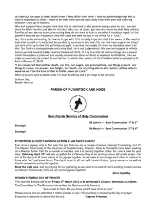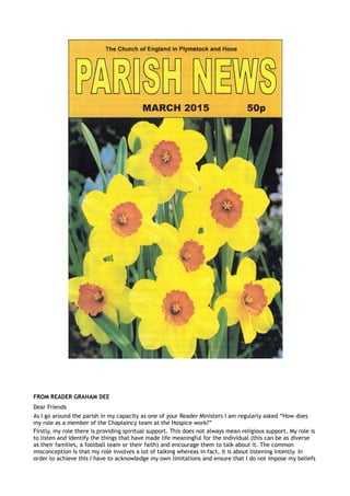 Graham Dee describes his role as a Reader Minister providing spiritual support at a hospice. He listens to patients, families, and staff without imposing his own beliefs. It can be exhausting, but he finds comfort knowing that through God, nothing can separate us from God's love. He feels privileged to be there for people during difficult times.