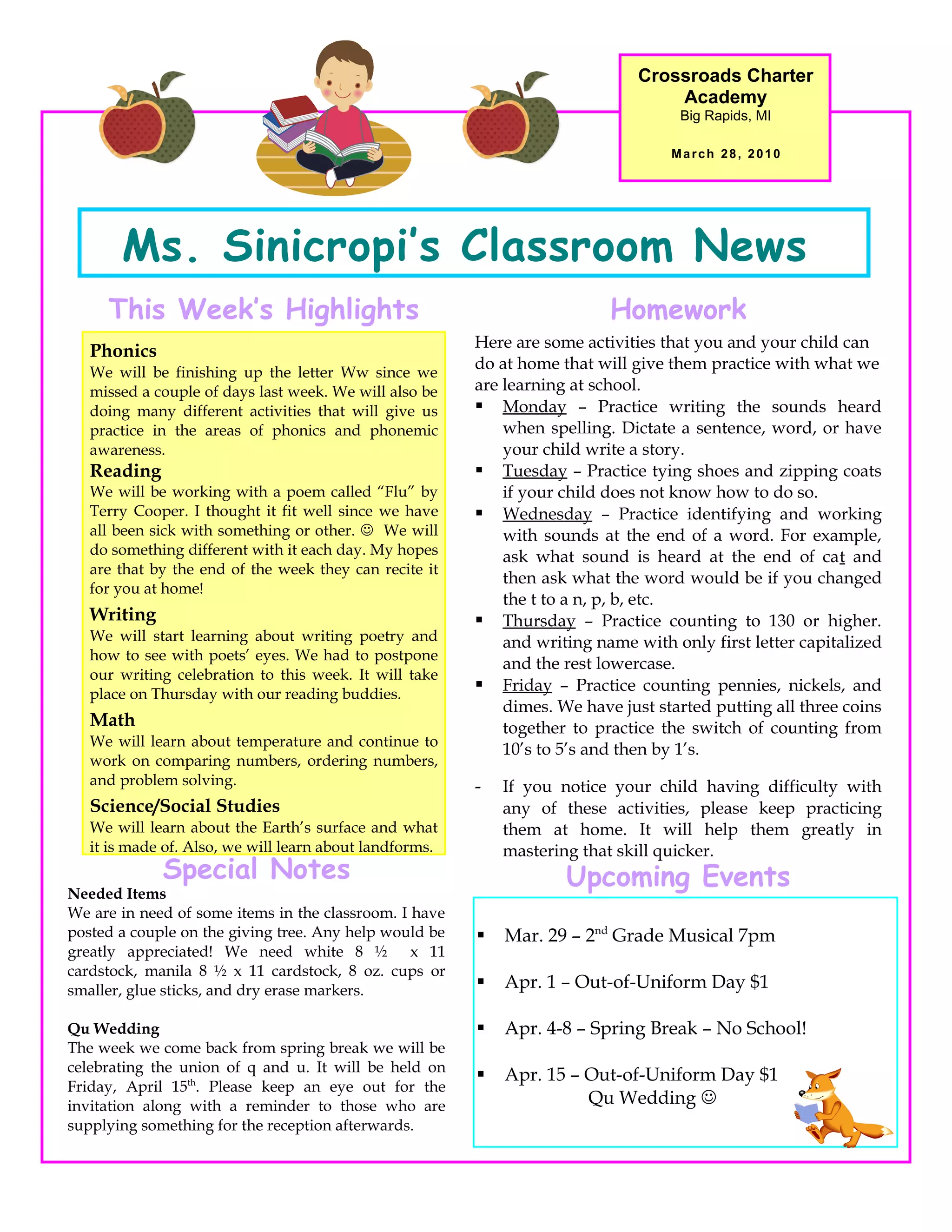 Ms. Sinicropi's class will be finishing up learning the letter W and doing phonics and phonemic awareness activities. They will also be working with a poem about the flu and doing different activities with it each day. The students will start learning about writing poetry. Homework this week includes practicing writing sounds, tying shoes, identifying word sounds, counting, and practicing with coins. Upcoming events include a second grade musical, out-of-uniform days, and spring break.