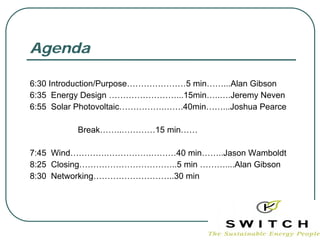 This document provides an agenda and summary for a home power workshop. The agenda includes introductions, presentations on energy design, solar photovoltaics, wind power, and a closing. The workshop aims to provide knowledge on solar and wind technologies and assist participants with home power projects. Follow up workshops will focus on home heating, power, and biomass. The solar photovoltaics portion will cover technology, installation, case studies, costs, and questions. The wind power portion will discuss availability, turbine selection, power usage, costs, and safety concerns. The workshop aims to educate homeowners on renewable energy options.