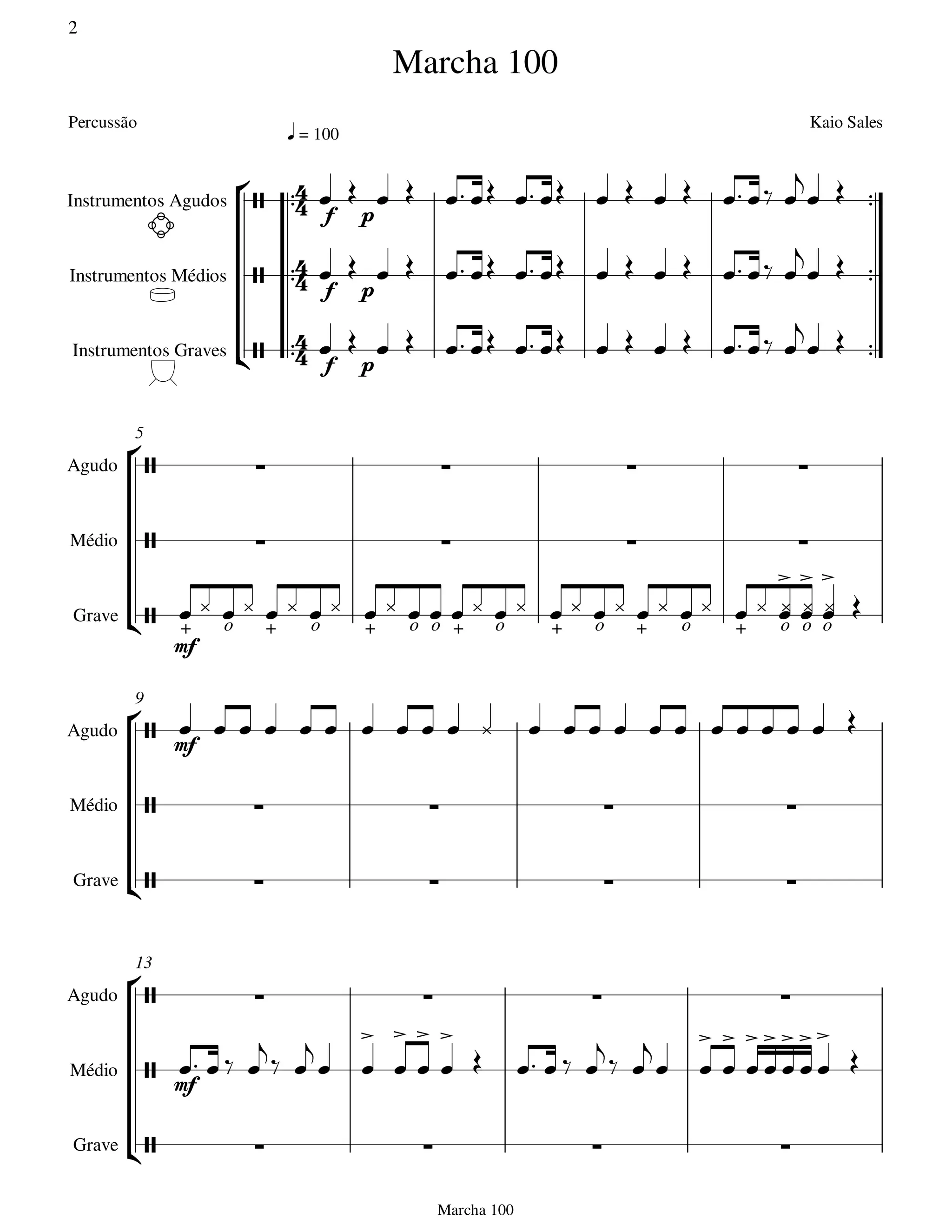 Marcha 100 Percussão Kaio Sales q = 100 Instrumentos Agudos f p Instrumentos Médios f p Instrumentos Graves f p 5 Agudo Médio Grave + o + o + o o + o + o + o + o o o mf 9 Agudo mf Médio Grave 13 Agudo Médio mf Grave Marcha 100