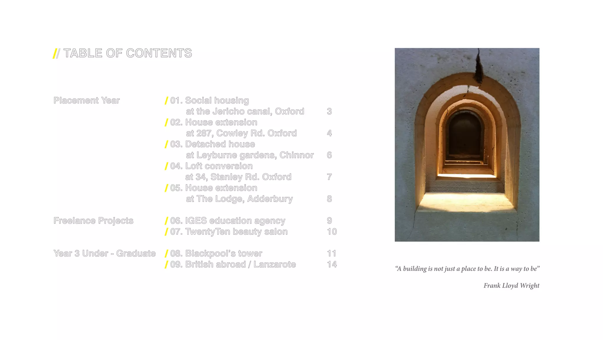 The document is a portfolio from 2015 containing details of various architectural projects. It includes summaries of 5 placement year projects involving social housing, house extensions, and a detached house. It also describes 2 freelance projects - an education agency interior design and a beauty salon interior. Finally, it provides details on 2 third year undergraduate projects - a tower restaurant concept in Blackpool and a semi-underground hotel design on the cliffs of Lanzarote.