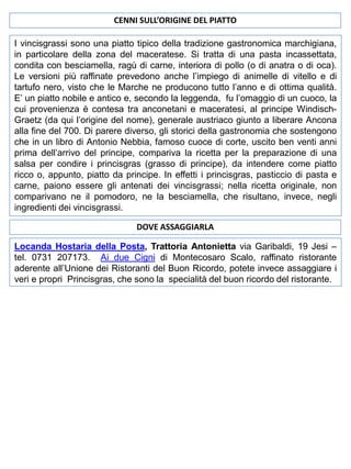 Il documento descrive la preparazione dei vincisgrassi, un piatto tipico marchigiano, elencando gli ingredienti e il metodo di cottura. Viene esplorata l'origine storica del piatto, le sue varianti e l'importanza culturale delle Marche nella gastronomia italiana. Infine, il testo mette in evidenza la diversità culinaria della regione, inclusi piatti di carne, di pesce e formaggi tipici.