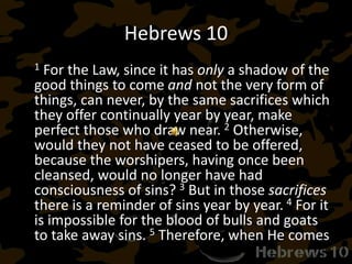 Hebrews 10 emphasizes the superiority of the new covenant through the one-time sacrifice of Jesus Christ, contrasting it with the repetitive and ineffective sacrifices of the old covenant that only reminded people of their sins. It underscores the importance of obedience to God's will and encourages believers to draw near to God with confidence, hold fast to their faith, and support one another in good deeds. The chapter warns against willful sinning and the serious consequences that follow, while affirming the promise of forgiveness and a transformed heart under the new covenant.
