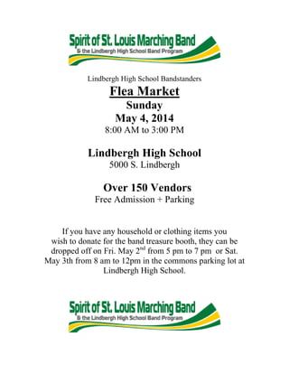 The Lindbergh High School Bandstanders are holding a flea market on May 4th from 8:00 AM to 3:00 PM at Lindbergh High School. Over 150 vendors will be present and admission and parking are free. Household or clothing items can be donated for the band's treasure booth by dropping them off on May 2nd from 5-7 PM or May 3rd from 8 AM to 12 PM in the school's commons parking lot.