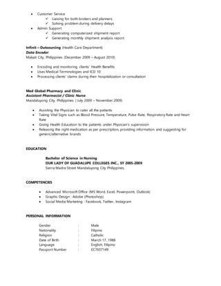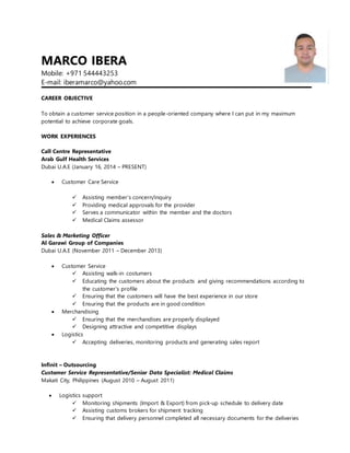 Marco Ibera is seeking a customer service position where he can utilize his experience in customer care, sales and marketing, logistics, and medical claims processing. He has over 5 years of experience in customer service roles in the healthcare industry in both the Philippines and UAE. His resume details his responsibilities and achievements in roles with companies like Arab Gulf Health Services, Al Garawi Group of Companies, and Infinit Outsourcing, where he assisted customers, processed medical claims, ensured quality customer experiences and product merchandising, and generated reports. He has a Bachelor's degree in Nursing from Our Lady of Guadalupe Colleges in the Philippines.