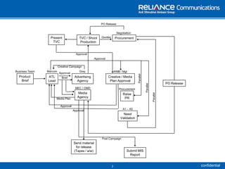The document outlines the process flow chart for an ATL marcom campaign. It involves briefing the advertising agency and media agency, developing a creative campaign and media plan, obtaining approvals from management, raising procurement needs, negotiating quotes, releasing purchase orders in parallel, obtaining final approvals for the TVC, and submitting a post-campaign report.