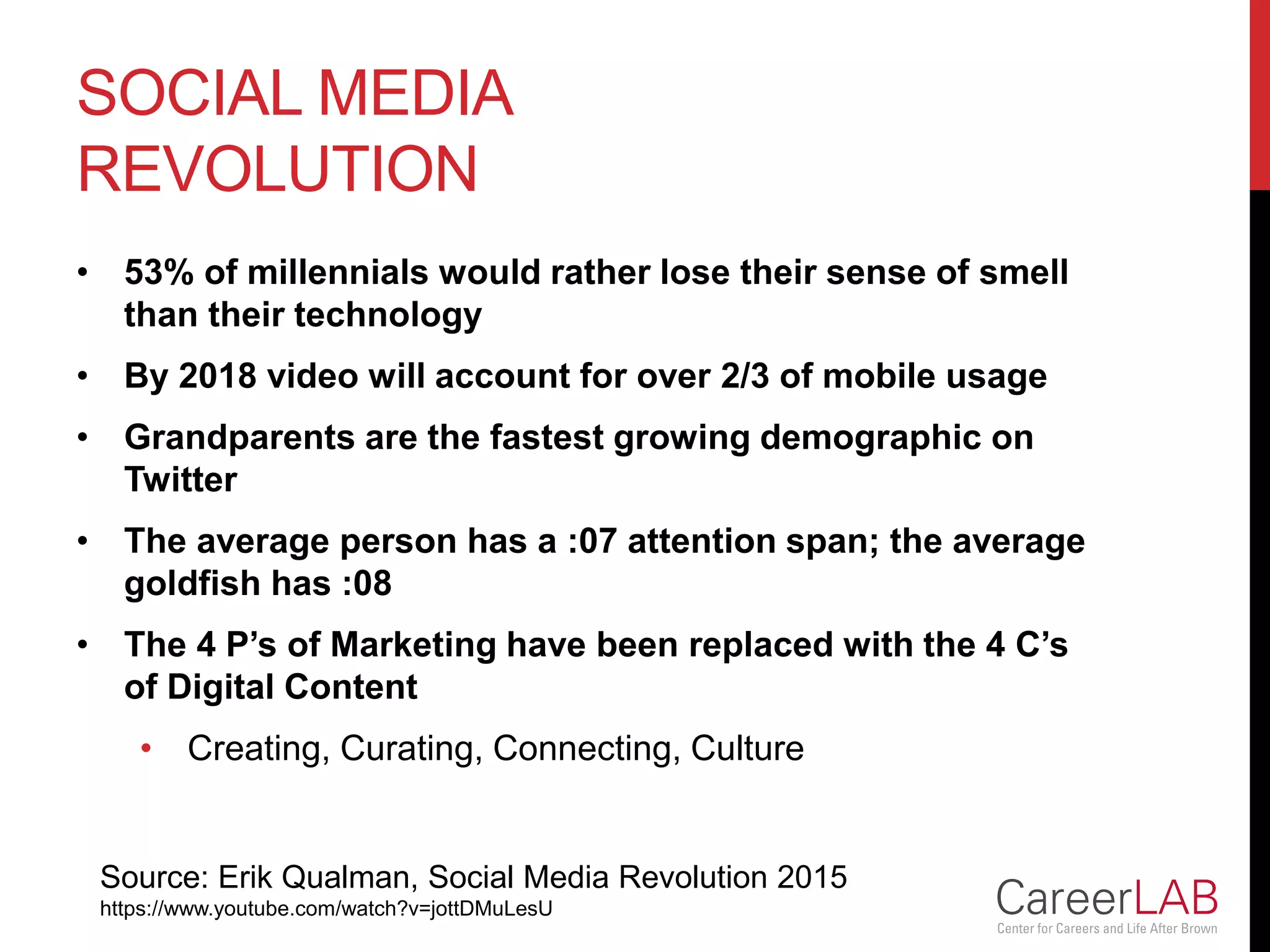 This document discusses developing an effective social media strategy and using metrics to drive results. It provides an overview of trends in social media usage. It then details how CareerLab at Brown University manages their social media presence across Twitter, Facebook, Instagram, and video platforms. They utilize a team of student peers to generate and post engaging content. The document stresses the importance of defining metrics and goals to track engagement, reach, follower growth, and content performance. It provides recommendations on best practices like sharing student stories, leveraging campus events, and maintaining consistency while testing new strategies and keeping up with digital trends.