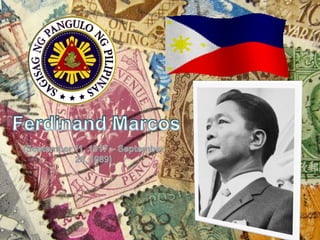 Ferdinand Marcos served as president of the Philippines from 1965 to 1986. During his first term, he outlined infrastructure projects like roads, bridges, and power plants. He also sought to strengthen the judiciary, national defense, and combat corruption. However, his regime became increasingly authoritarian and corrupt over time. Large sums of money were embezzled, and he declared martial law in 1972. Growing unrest and the assassination of Benigno Aquino led to the People Power Revolution in 1986 that ousted Marcos into exile.
