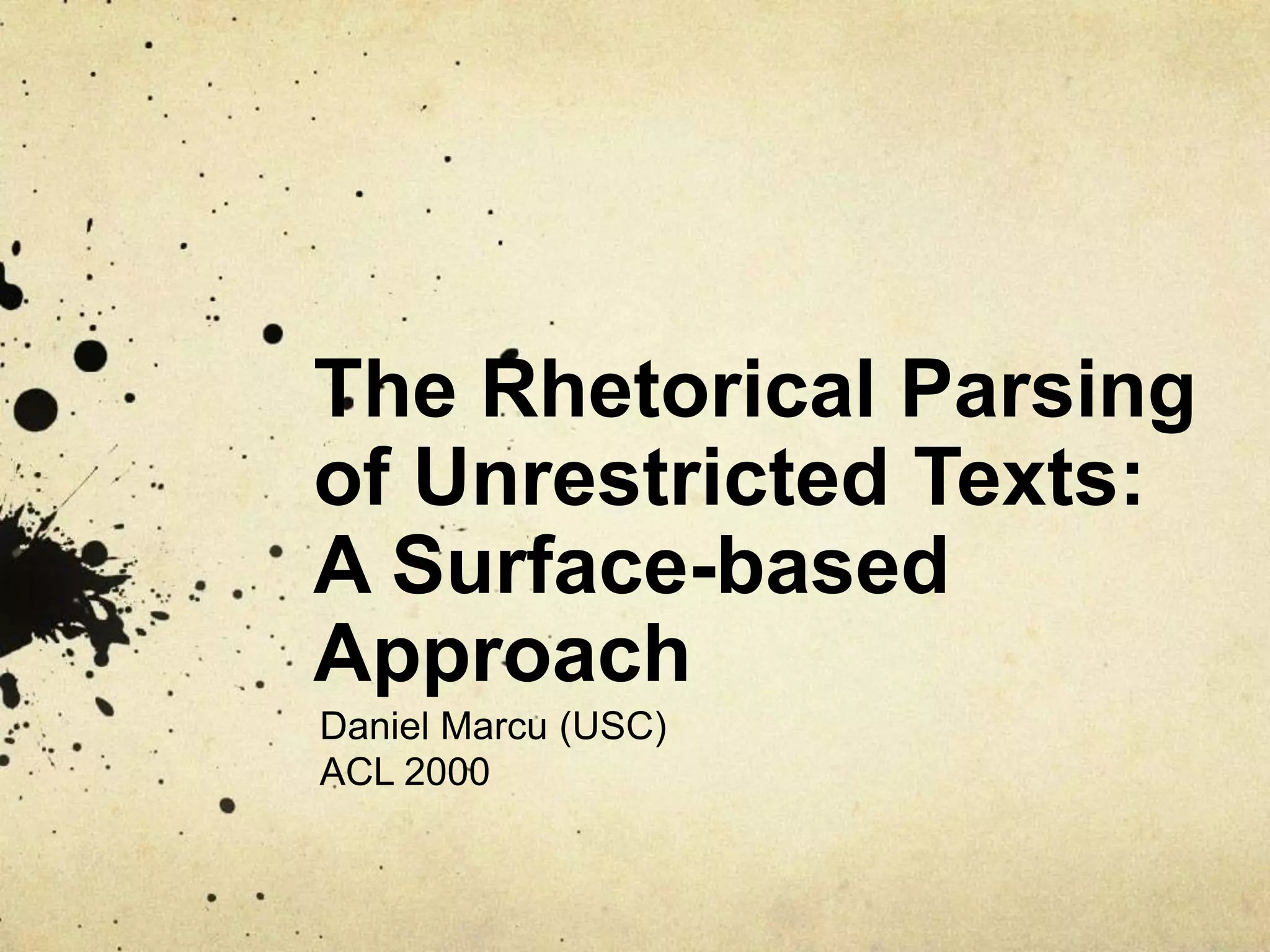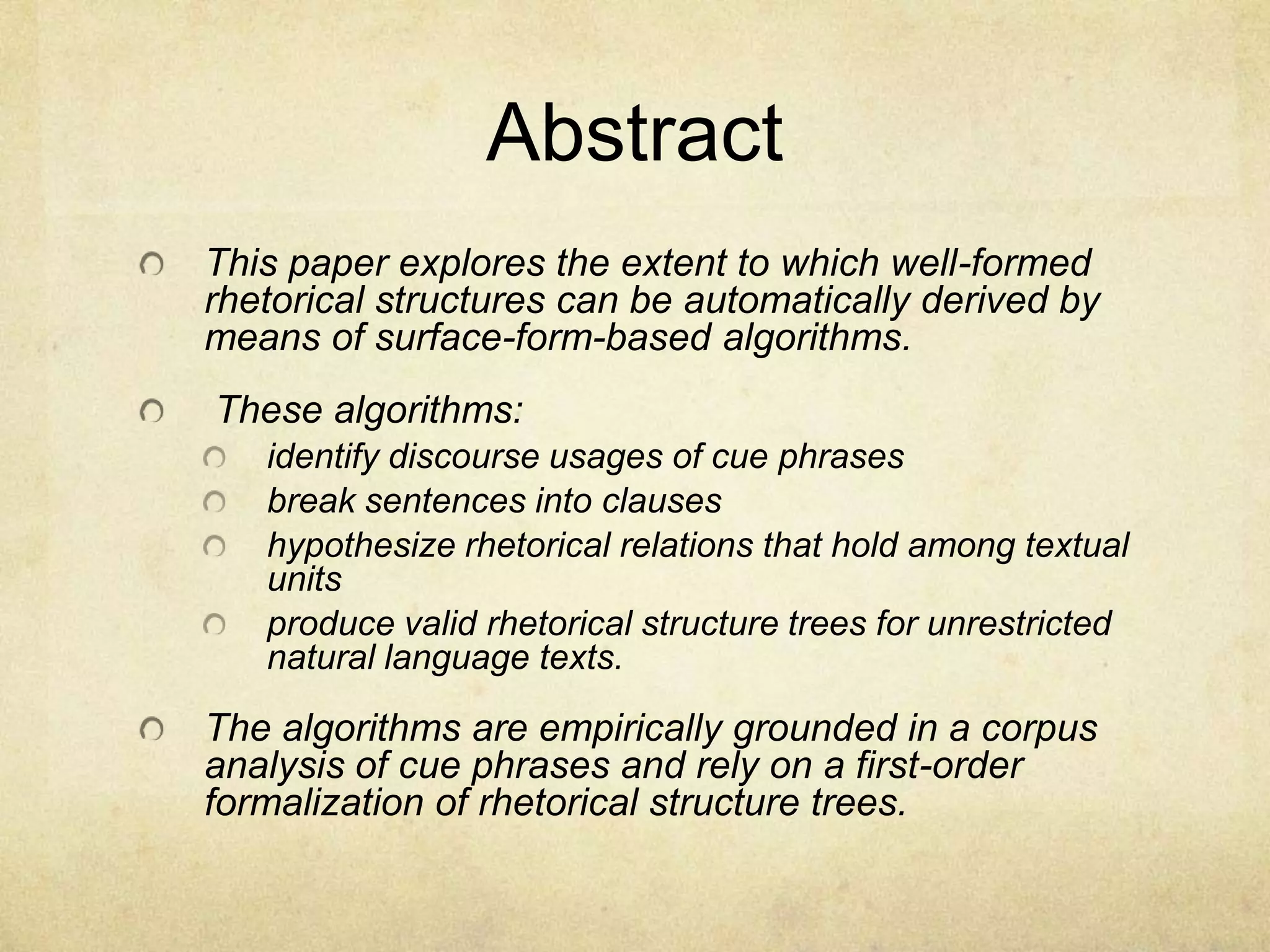 This paper presents algorithms for automatically deriving rhetorical structures from unrestricted texts using surface-form-based methods, focusing on cue phrases and cohesion. The effectiveness of these algorithms is evaluated intrinsically by comparing automatically derived structures with manually constructed ones, and extrinsically through their successful application in text summarization. The findings indicate that rhetorical structures created by these algorithms can be accurately identified and are valuable for enhancing natural language processing tasks.
