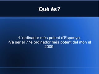 Què és? ·L'ordinadormés potent d'Espanya. ·Va ser el 77è ordinador més potent del món el 2009.