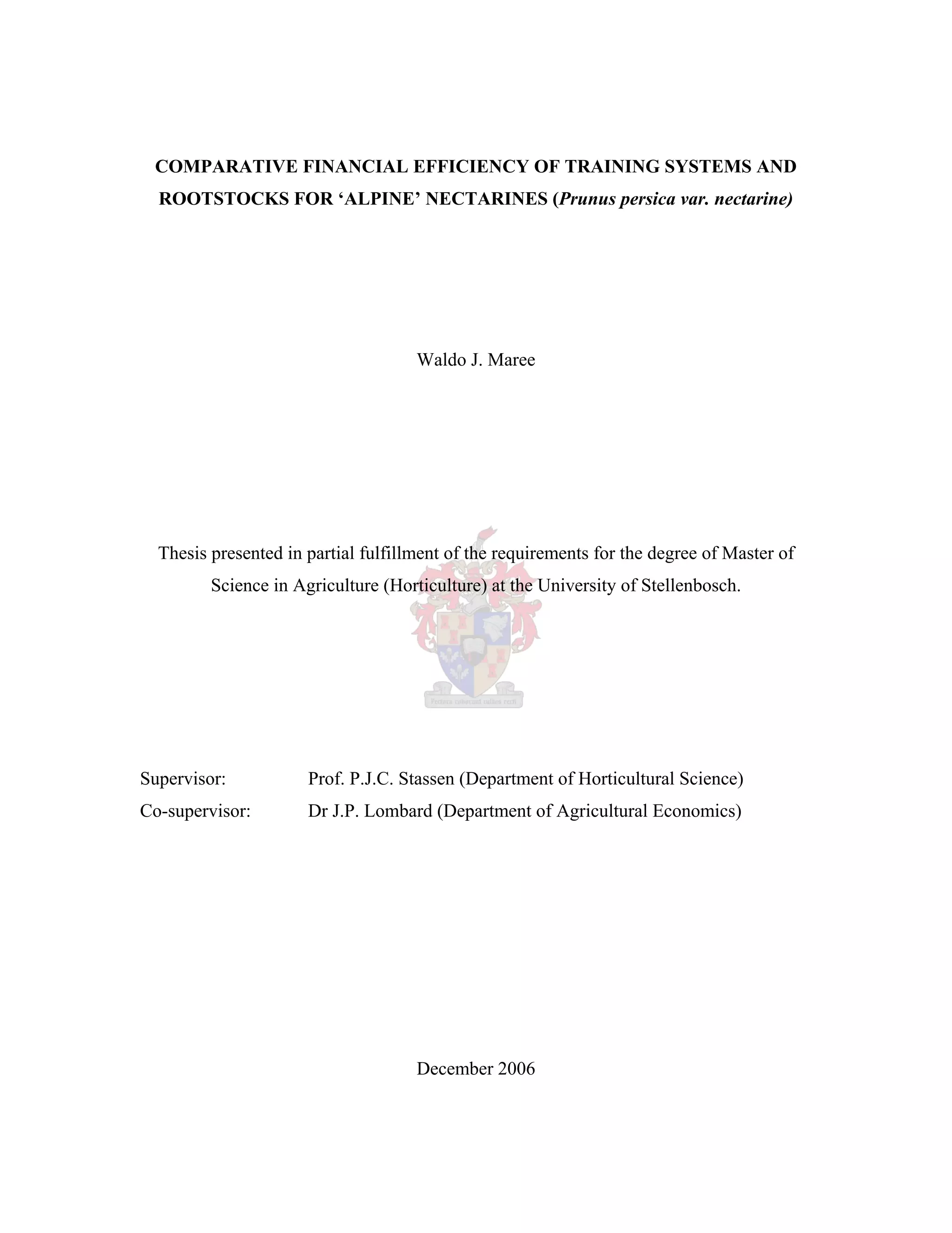This thesis evaluates different training systems and rootstocks for 'Alpine' nectarine production in terms of production, labor requirements, and financial efficiency. 'Alpine' nectarines were planted using four training systems (four-leader, two-leader, proleptically trained central leader, and sylleptically trained central leader) on three rootstocks (GF 667, SAPO 778, and Kakamas seedling). Data on yield, fruit size, labor, and light penetration within the canopy were collected. An economic analysis found that according to the internal rate of return, the four-leader system was preferred, but the net present value calculation found the two-leader system was preferred when