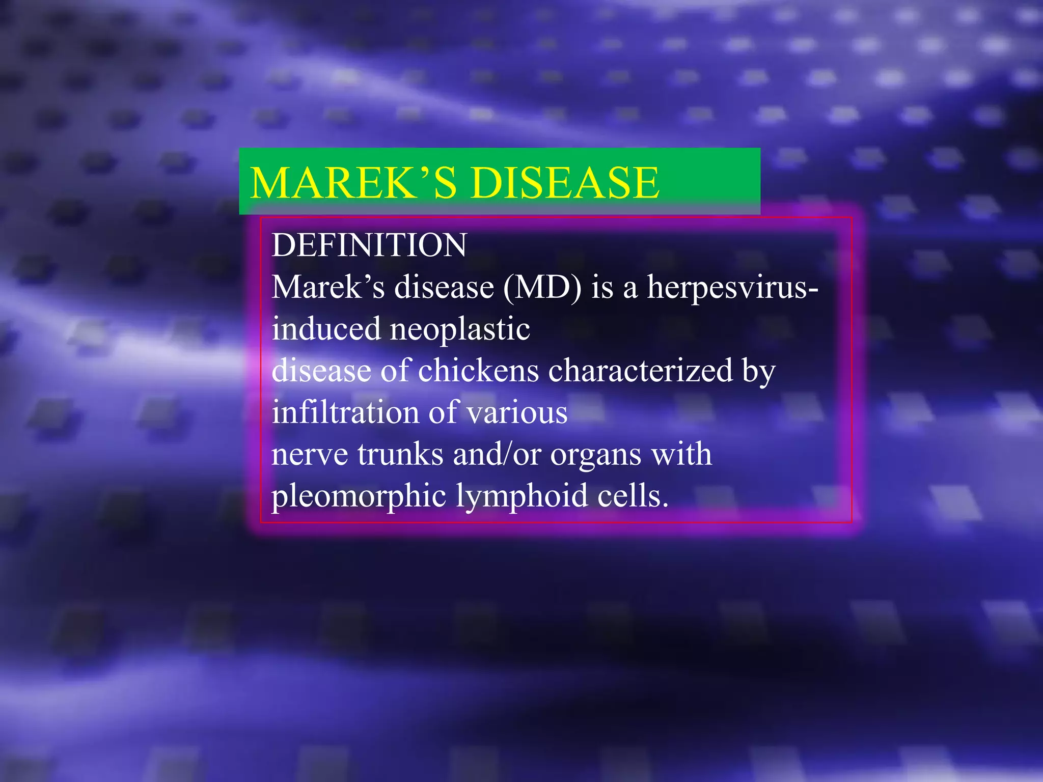 Marek's disease is a herpesvirus-induced cancer in chickens that causes infiltration of lymphoid cells in nerves and organs. It most commonly occurs in young chickens 2-7 months old. The disease was first described in 1907 and causes paralysis. Increased mortality in the 1950s-60s accelerated research which isolated the causative herpesvirus in 1967. Infected chickens shed infectious virus particles in dander which is the main mode of transmission. Clinical signs include depression, paralysis, and visceral tumors. Microscopically, tumors are characterized by pleomorphic lymphocytes. Diagnosis is usually based on history and age of affected birds. Commercial flocks are vaccinated at 18 days of embryonation or hatch