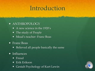 Margaret Mead was an influential 20th century anthropologist who studied how culture and environment shape human behavior and development. Her most famous work, Coming of Age in Samoa, analyzed the transition to adulthood in Samoan society and found that Samoan adolescents experienced less stress and conflict compared to American youth. However, Mead's work has also faced criticism for potentially misrepresenting Samoan culture. Overall, Mead was an early proponent of the view that gender roles and social norms are culturally determined rather than biologically fixed.