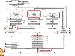 Margarine is an emulsion consisting of 80% fats and oils and 20% of an aqueous phase. It is produced through several steps including preparation of the water and fat phases, emulsion preparation, pasteurization, chilling, crystallization, kneading, and packing. Margarine provides around 100 calories and contains saturated, polyunsaturated, and monounsaturated fats while being fortified with vitamins and minerals. It is a designed food staple that can be tailored to provide nutritional and functional benefits.