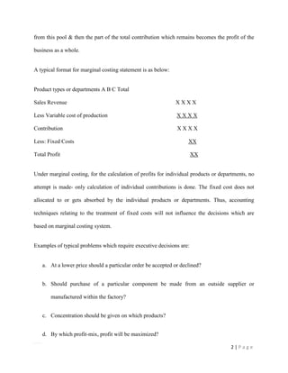 Marginal costing is a technique that differentiates between fixed and variable costs. It assigns only variable costs to cost units and writes off fixed costs for the period against total contribution. Contribution is calculated as sales revenue minus variable costs. Marginal costing is useful for decision making as it shows the effect on profit of changes in volume or product mix. Key aspects include classifying costs, calculating contribution, and using contribution to determine the break-even point where total revenues equal total costs. Marginal costing provides information on product and segment profitability without needing to allocate fixed overhead costs.