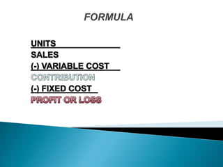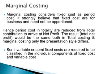 Marginal costing considers fixed costs as period costs and does not apportion them. It reduces total period costs from total contribution to arrive at net profit. The results are the same as total costing, only the presentation differs. Semi-variable costs have fixed and variable components. Marginal costing is defined as accounting that charges variable costs to cost units and writes off fixed costs against aggregate contribution. Contribution is sales minus marginal costs. Profit-volume ratio measures profitability as contribution over sales. Break-even point is when contribution equals fixed costs. Marginal costing supports managerial decision making by evaluating a concern's position.