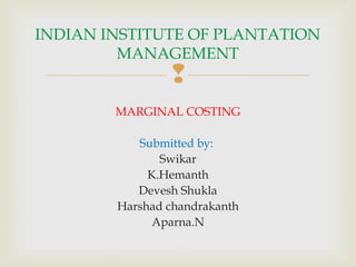 Marginal costing is a technique that differentiates between fixed and variable costs. It considers only variable costs for decision making purposes. Some key points: