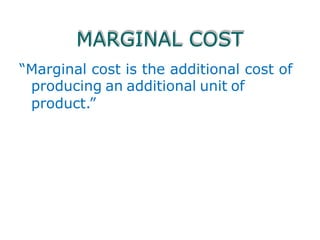 Marginal costing is a technique where only variable costs are treated as product costs and included in inventory valuation. Marginal cost is the additional cost of producing one additional unit of output. Marginal costing helps in decision making such as setting selling prices, exploring new markets, make or buy decisions, determining optimal product mix, and deciding whether to operate a plant or shut it down. An example shows how marginal costing can be used to determine whether a company should make or buy a component based on relevant costs.