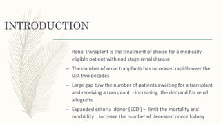 Renal transplant is crucial for patients with end-stage renal disease, yet there is a significant gap between the demand for and supply of donor kidneys, leading to the use of marginal donors to increase availability. These marginal donors include those with suboptimal kidney function or health risks, and while they may result in inferior outcomes compared to standard criteria donors, they still provide a survival advantage over patients awaiting transplants. Effective management protocols are essential for the transplantation of these kidneys, focusing on nephron protection and tailored immunosuppression strategies to improve outcomes.