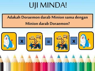 Dokumen ini membincangkan konsep darab dalam matematik dengan menggunakan contoh untuk menunjukkan bahawa urutan darab tidak mempengaruhi hasil, seperti 3 x 2 = 2 x 3. Terdapat aktiviti interaktif yang melibatkan 'big book' darab dan penyediaan lembaran kerja. Kesimpulannya, konsep darab adalah sama tidak kira urutannya, yang diperkukuhkan dengan soalan uji minda.