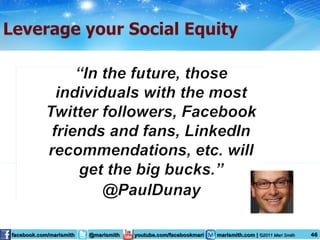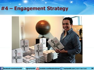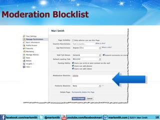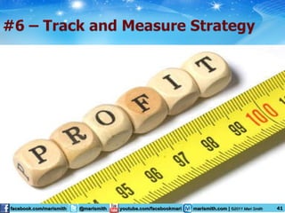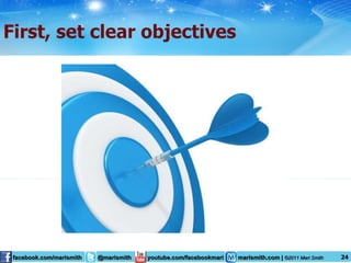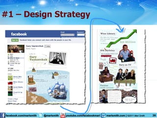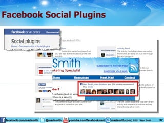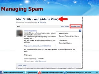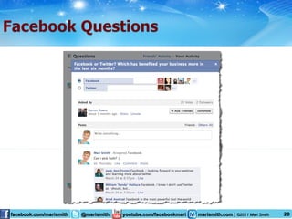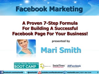 The document provides tips and strategies for using Facebook marketing based on a presentation by Mari Smith. It discusses key Facebook metrics like the number of active members and average time spent on the site. It then gives recommendations for how to post and engage on Facebook as a page or profile to build relationships and promote businesses or brands. Specific tactics covered include using tabs, apps, images, and other content to drive fan growth and conversions.