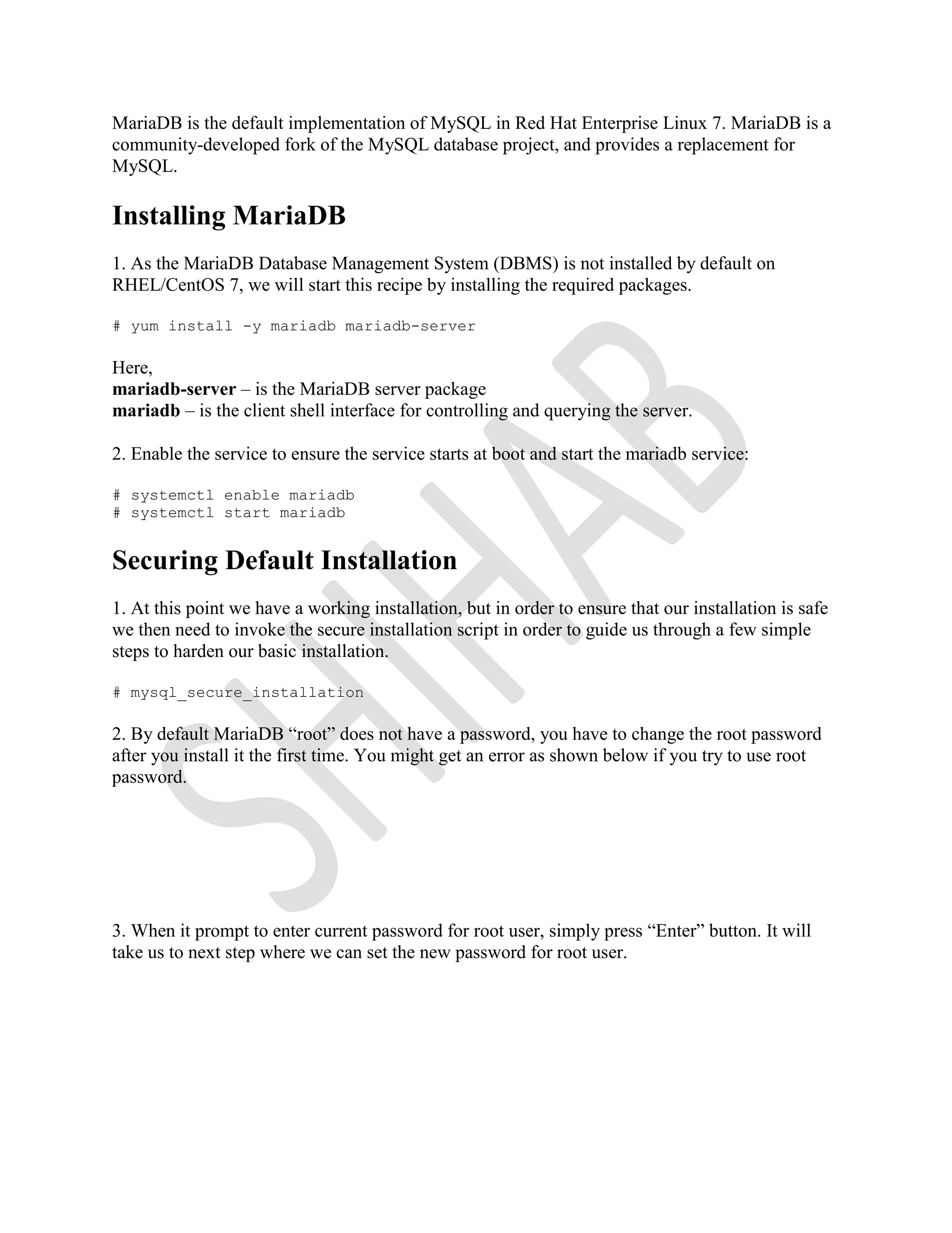 MariaDB is the default MySQL database installed on Red Hat Enterprise Linux 7. It is installed by running commands like "yum install mariadb" and then secured by running "mysql_secure_installation" to set the root password. Once installed and secured, databases and users can be created and the connection can be tested.
