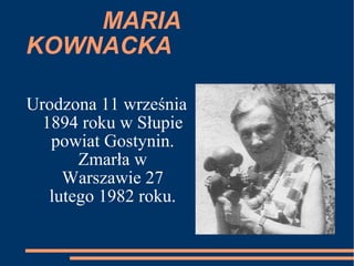 MARIA KOWNACKA Urodzona11 września 1894 roku w Słupie powiat Gostynin. Zmarła w Warszawie 27 lutego 1982 roku.