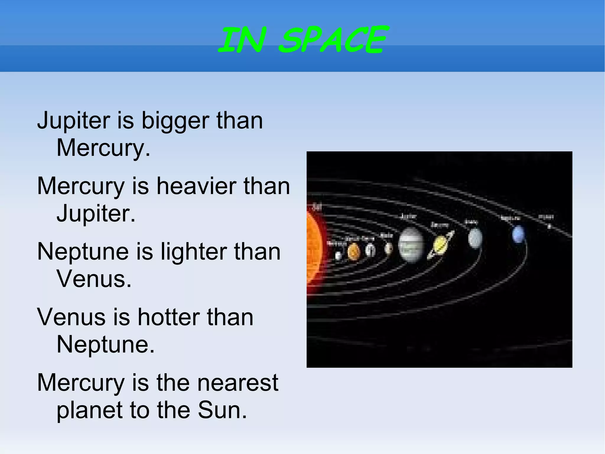 This document compares properties of planets in our solar system, stating that Jupiter is bigger than Mercury, Mercury is heavier than Jupiter, Neptune is lighter than Venus, and Venus is hotter than Neptune, with Mercury being the closest planet to the Sun. It also describes objects in space, noting there is an astronaut, rocket, and flag, but there is not an alien or telescope.