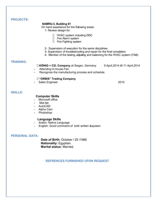 This document is a resume for Mariam Atef Saleeb, an Egyptian mechanical engineer with over 8 years of experience in project and sales engineering. She holds a Bachelor's degree in Mechanical Engineering from Helwan University, Egypt. Her career experience includes roles as a project and sales engineer and mechanical engineer for The Egyptian company for supplies, where she was responsible for following various projects in oil, gas, marine, and other industries. She also lists relevant skills, education history, and personal details.