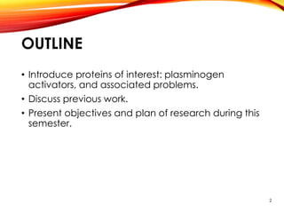 This document outlines a research project to clone and express variants of human plasminogen activator (HPLAT) in E. coli in order to develop an improved tissue plasminogen activator (tPA) with a longer half-life. The researchers designed mutations to the glycosylation sites of tPA and will clone the mutant HPLAT genes into E. coli, induce expression, purify the proteins, and analyze their fibrin specificity, half-life, and inhibition by PAI-1 compared to wild type tPA. The goal is to develop an improved tPA through mutagenesis for treatments of cardiovascular diseases.