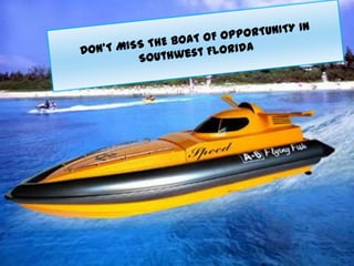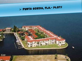 This document discusses real estate investment opportunities in Southwest Florida, specifically Cape Coral. It notes that the housing market in Southwest Florida has stabilized with demand outpacing supply and home prices increasing. Cape Coral offers affordable housing and was named a top place to retire by CNN Money in 2012 and 2009. The document also provides statistics showing large percentage increases in median home prices from 2010 to 2011 in several Florida cities including Fort Myers-Cape Coral at 34.46% growth. Cape Coral is highlighted for its extensive canal system and amenities that appeal to retirees looking for a low tax, affordable place to live near beaches and amenities.
