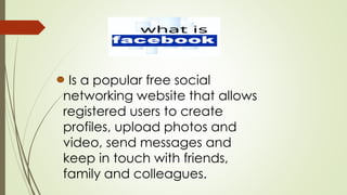 Facebook is a popular social media website that allows users to create profiles, upload content, and connect with friends and family. It has over 1 billion active users and has become an important platform for communication, business, and staying informed on news and current events. It was founded in 2004 by Mark Zuckerberg and grew rapidly at Harvard University before expanding more broadly.