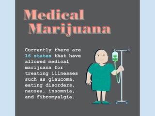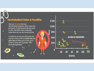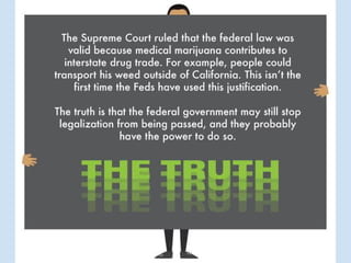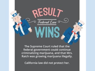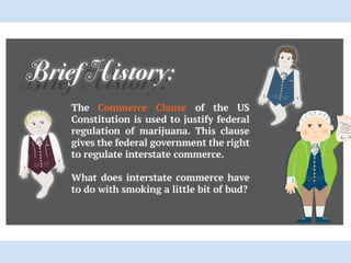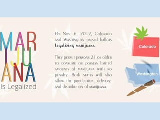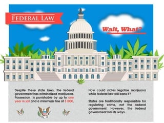 The document is a brief guide outlining marijuana state laws and federal regulations, listing states where medical marijuana is legal. It highlights specific states such as California, Arizona, and New Jersey among others. For further details, it references an infographic and historical context provided through external links.