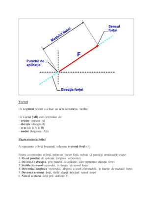 Mărimile fizice pot fi scalare sau vectoriale; mărimile scalare sunt caracterizate printr-o singură valoare numerică, în timp ce mărimile vectoriale includ modul, direcție și sens. Forța este o mărime vectorială, definită prin punctul de aplicație, valoarea numerică exprimată în newtoni, direcția și sensul. Reprezentarea unei forțe implică desenarea unui vector forță care ilustrează aceste caracteristici.