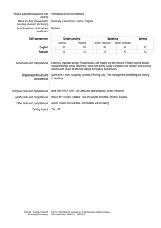 This document is a curriculum vitae for Marin Marinov. It includes his personal details like name, address, date of birth and contact information. It also outlines his work experience as a seller and laborer for a fishing company in 2010. His education is listed, including a Bachelor's degree in Economics from the University of Economics in Varna, Bulgaria from 2008-2012. It also includes details about his language skills, social skills, organizational skills and computer skills.