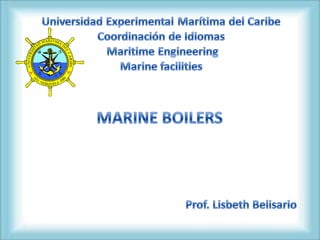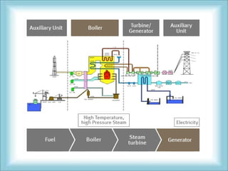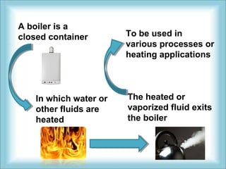 A boiler is a closed container that heats water or other fluids, which are then used for processes, heating applications, or to produce steam. Boilers come in two main types - fire tube boilers where hot gases pass through tubes surrounded by water, and water tube boilers where water passes through tubes surrounded by hot gases. Boilers have internal parts, valves, gauges, and mountings like safety valves, water level indicators, and drain valves that are directly related to pressure parts and boiler operation.