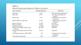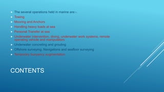 This document summarizes various marine operations including towing, mooring, handling heavy loads at sea, personnel transfer, diving, remote operated vehicles, and underwater construction activities. It discusses the equipment, considerations, and methods used for each type of operation. Towing operations require strong attachments that can withstand dynamic loads. Mooring uses anchors and mooring lines to secure vessels. Personnel transfer faces challenges of transferring people safely between moving vessels in sea states. Diving and ROVs allow underwater inspection and intervention.