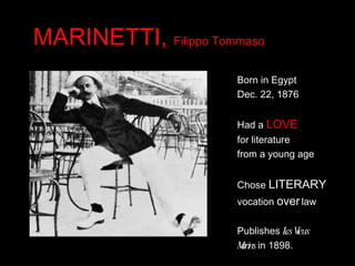 Filippo Tommaso Marinetti, born in Egypt in 1876, chose literature over law and was heavily influenced by Nietzsche and the socio-political landscape of Italy. He founded the Futurist movement, which sought to modernize Italian art and society through themes of technology, speed, and nationalism, publishing several manifestos advocating for a revolution in artistic expression. Marinetti remained an active and controversial figure until his death in 1944, emphasizing a break from traditional artistic conventions.