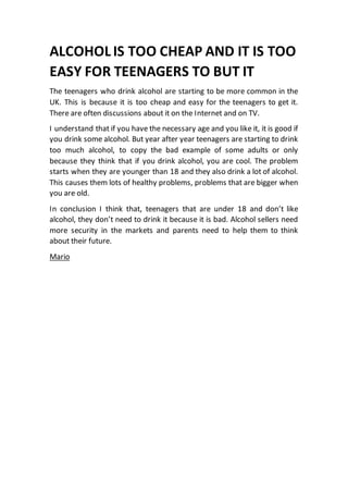 Alcohol is too cheap and easy for teenagers to obtain in the UK, leading to more underage drinking problems. While drinking in moderation at the legal age is acceptable, teenagers often drink too much too young by copying adults or trying to appear cool, which can cause health issues. To address this, alcohol sellers should increase security and parents should help teenagers focus on their future rather than drinking underage.