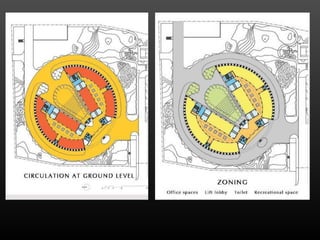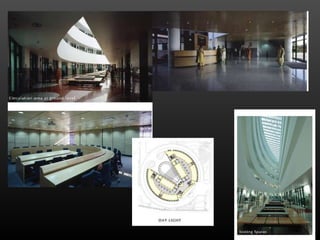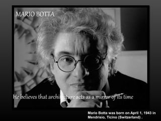 Mario Botta is a Swiss architect born in 1943 in Mendrisio, Switzerland. He believes architecture should reflect its time. Botta graduated from architecture school in Venice in 1969 and has since designed several notable buildings using geometric shapes and forms. His Tata Consultancy Services building in Hyderabad, India from 1998 exemplifies his style with its massive cylindrical shape divided by deep vertical slits and clad in red stone.