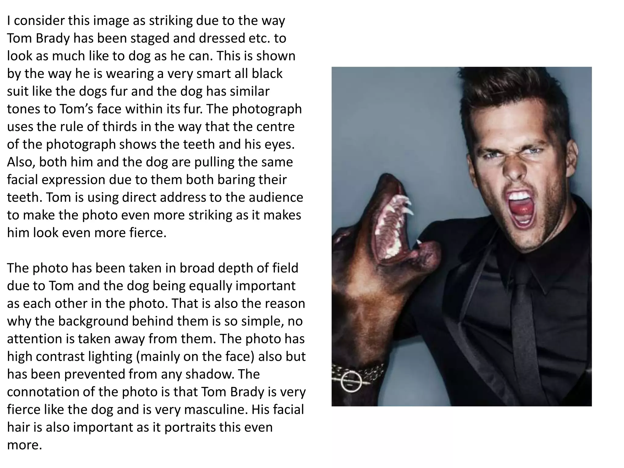 This photograph shows Tom Brady dressed in a black suit resembling a dog's fur, with similar tones in their faces. The photograph uses the rule of thirds to draw attention to their eyes and teeth as they bare them in the same facial expression. Brady engages in direct address to appear more fierce. The broad depth of field and simple background ensure equal focus on Brady and the dog. High contrast lighting emphasizes their faces while avoiding shadows. The connotation is that Brady is as fierce as the dog and highly masculine.