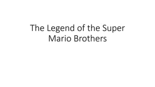The Legend of the Super Mario Brothers is set in a future where a massive superstructure that houses more people than ever before has been constructed. Mario and Luigi work as plumbers in the superstructure's enormous infrastructure. They must race to save the superstructure after the militant Bowser plans to overload the energy system through a construction project, which could destroy the structure and kill its inhabitants. Mario, Luigi, and their dinosaur friend Yoshi work to stop Bowser's plan, though it ultimately leads to Yoshi sacrificing himself so the brothers can flood the area and safely disperse the overloading energy, even if it means they and Bowser perish in the process.