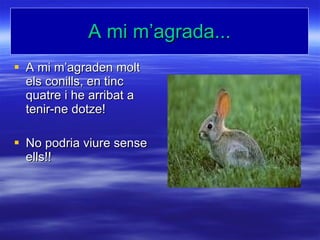 A mi m’agrada...A mi m’agraden molt els conills, en tinc quatre i he arribat a tenir-ne dotze! No podria viure sense ells!! - 3.