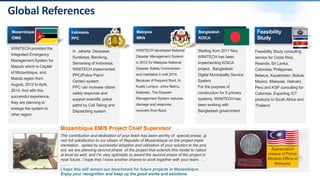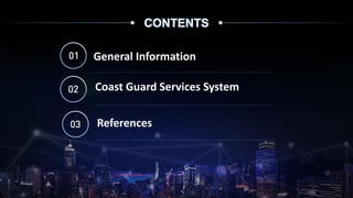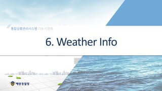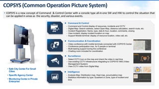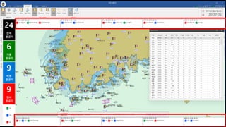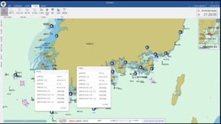 This document summarizes an integrated maritime command and control system developed by a Korean company. The system integrates various data sources and surveillance tools to provide situational awareness and coordination for emergency response. It includes features such as an integrated nautical map, video integration and drone surveillance, mobile task management, pollution monitoring, and asset management. The system aims to provide South Korean maritime agencies with integrated tools to facilitate emergency response and security operations.