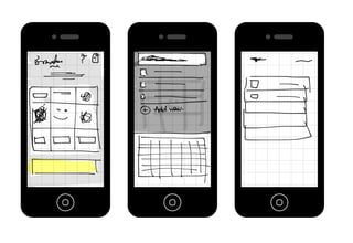 The document discusses sketching and prototyping techniques for designing products and interfaces. It emphasizes that sketching with pen and paper is an easy and effective way to prototype ideas using simple lines and diagrams before implementing designs digitally. The document also advocates an iterative design process of sketching, discussing, and refining prototypes to gather feedback and improve designs.