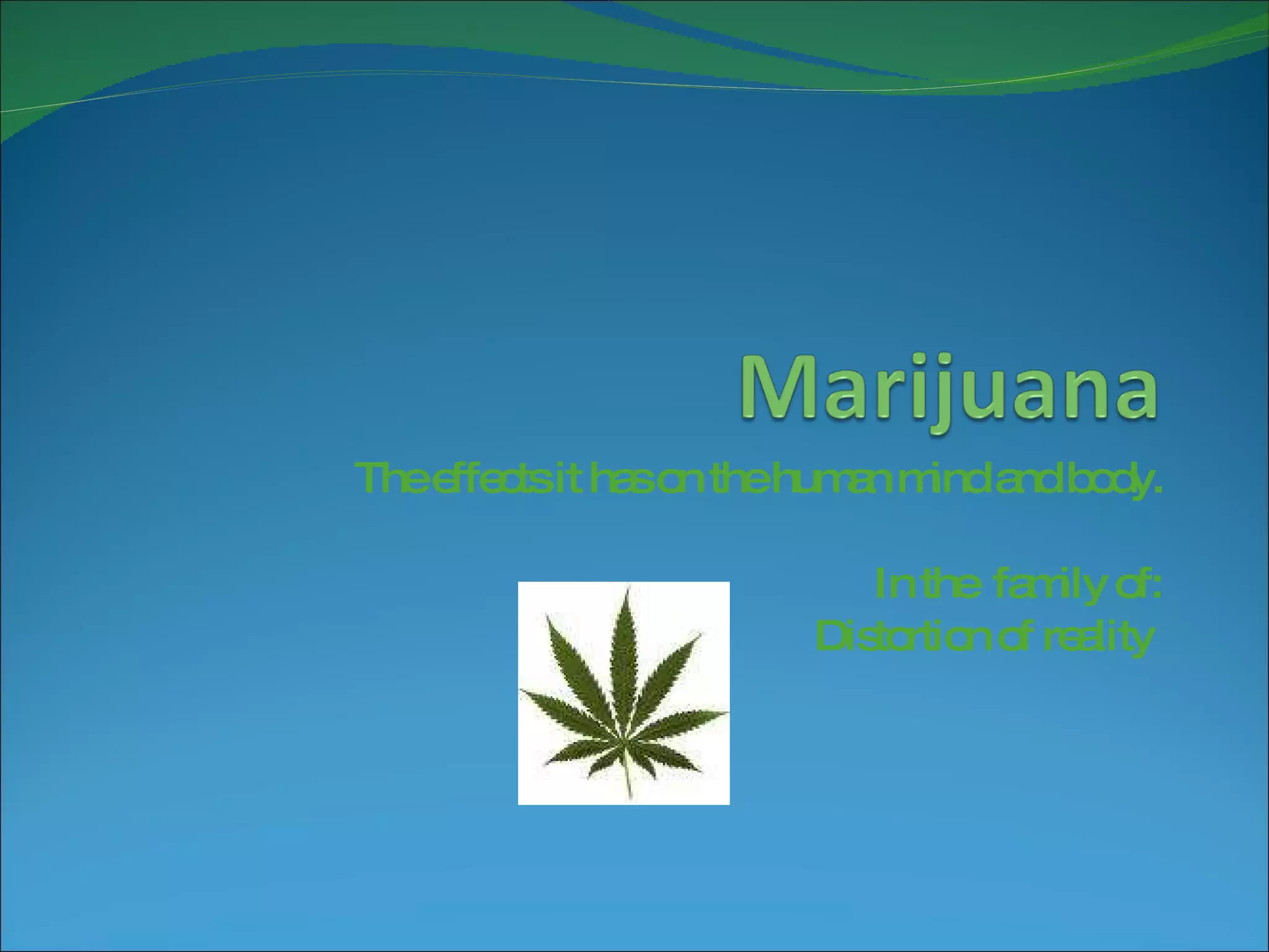 The document summarizes the effects of marijuana on the human mind and body. It states that marijuana can impair short-term memory, alter time perception, and reduce the ability to concentrate or coordinate movements. It also mentions increased heart rate and risk of heart attack, as well as potential mental addiction and withdrawal symptoms when use is stopped. The document lists some slang terms for marijuana and notes myths about the drug being harmless or less dangerous than cigarettes. It outlines short term effects like impaired movement and long term impacts like respiratory problems. Finally, it mentions some potential medical uses of marijuana.
