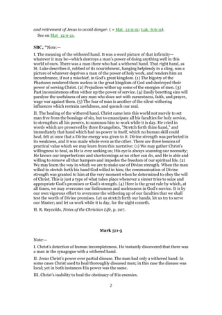 In this document, the healing of a man with a withered hand by Jesus on the Sabbath is narrated, highlighting the conflict between Jesus and the Pharisees over Sabbath laws. Jesus illustrates that doing good is permissible even on the Sabbath, emphasizing the importance of compassion and the impotence of rigid adherence to tradition. The event serves as a lesson on the dangers of bigotry and the necessity of responding to human suffering with kindness.